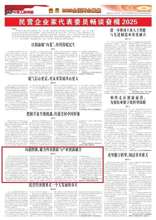 “新時(shí)代新征程民營(yíng)經(jīng)濟(jì)發(fā)展前景廣闊、大有可為,廣大民營(yíng)企業(yè)和民營(yíng)企業(yè)家大顯身手正當(dāng)其時(shí)。”2月17日,習(xí)近平總書(shū)記在民營(yíng)企業(yè)座談會(huì)上發(fā)表重要講話(huà),為民營(yíng)經(jīng)濟(jì)發(fā)展注入強(qiáng)大信心和動(dòng)力。全國(guó)兩會(huì)上,政府工作報(bào)告提出“扎扎實(shí)實(shí)落實(shí)促進(jìn)民營(yíng)經(jīng)濟(jì)發(fā)展的政策措施”,激勵(lì)民營(yíng)企業(yè)家?jiàn)^發(fā)圖強(qiáng)、破浪前行。連日來(lái),民營(yíng)企業(yè)家代表委員深入學(xué)習(xí)貫徹總書(shū)記在民營(yíng)企業(yè)座談會(huì)上重要講話(huà)精神和全國(guó)兩會(huì)精神,聚焦民營(yíng)經(jīng)濟(jì)健康發(fā)展、高質(zhì)量發(fā)展,暢談奮楫2025的信心、決心,交流科技創(chuàng)新、轉(zhuǎn)型變革的謀劃、實(shí)踐,勇?lián)χ袊?guó)式現(xiàn)代化建設(shè)的時(shí)代重任。3月8日,《中華工商時(shí)報(bào)》以《向新圖強(qiáng),聚力科技創(chuàng)新與產(chǎn)業(yè)創(chuàng)新融合》為題,報(bào)道了全國(guó)人大代表、榮程集團(tuán)董事會(huì)主席張榮華的心聲。